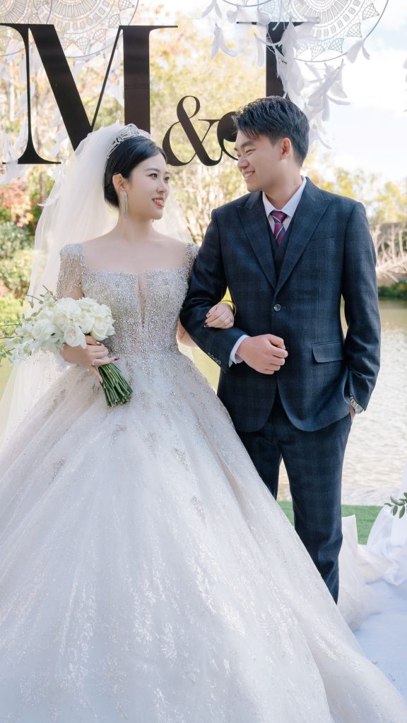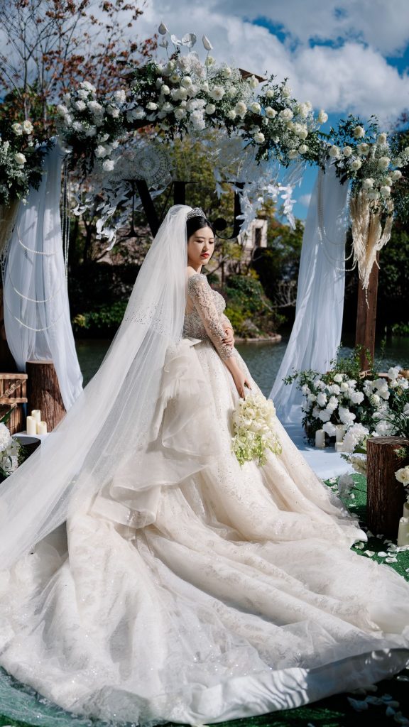 新娘身着华丽的白色婚纱,长长的头纱如瀑布般垂落,层层叠叠的裙摆铺满地面,每一处蕾丝与刺绣都精致无比,仿佛将世间所有的美好都凝聚于一身。她静静伫立在那里,宛如从童话中走出的公主,等待着属于自己的幸福时刻。