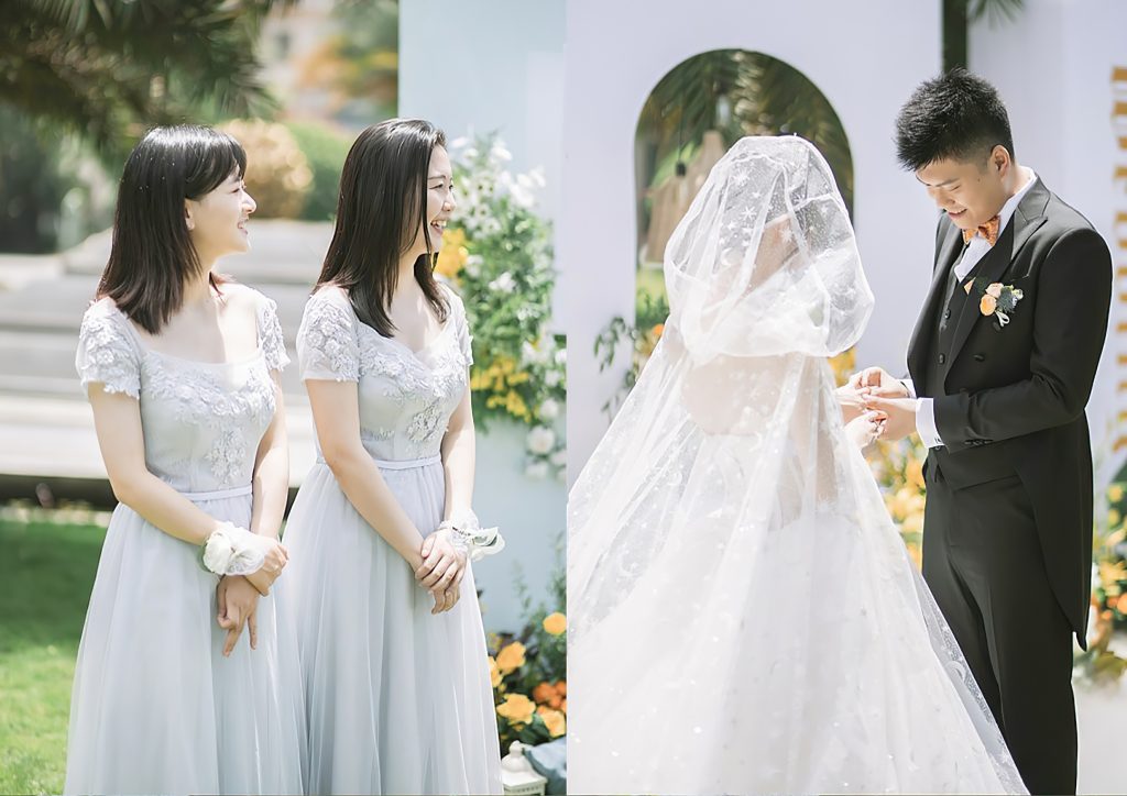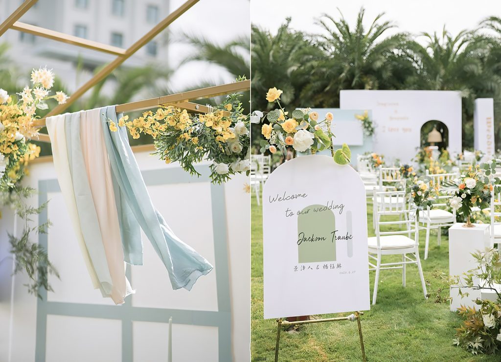这场户外婚礼以白、浅蓝为主色调,搭配明黄色花束,在草坪的映衬下,营造出清新自然的氛围。背景板简约大气,印着新人名字与 “I love you”,传递出温馨爱意。仪式区白色座椅整齐排列,石板小径旁花团锦簇,婚车也被鲜花精心装饰,细节处尽显用心。更难得的是,婚礼预算不高,从花艺到场地布置,每一笔开支都清晰透明,用巧思在小预算里打造出了浪漫且有质感的婚礼场景。