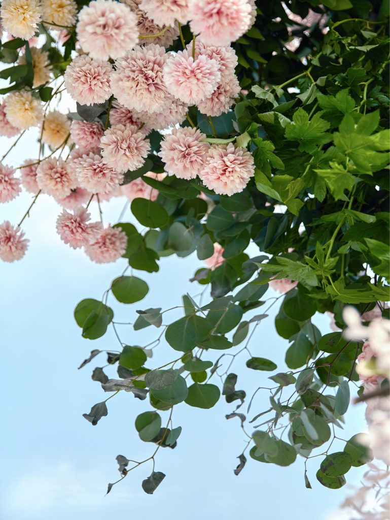 仪式区的白色座椅,搭配着粉白相间的花束与飘逸的白丝带,简约又不失精致。抬头望去,粉团似的花朵与绿叶相映成趣,在蓝天的映衬下,更显清新柔美。新人在花海与绿植的簇拥中,或牵手凝望,或温柔相拥,每一个瞬间都定格成浪漫的画面,仿佛将春日的美好都收进了这场婚礼里,给人一种纯粹又治愈的幸福感。