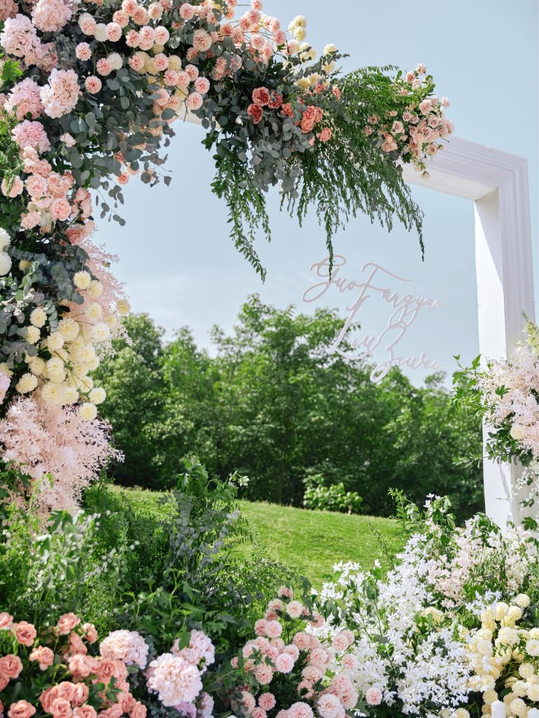 这场户外婚礼以清新的粉白色为主调,与绿意盎然的草坪相融,营造出自然又浪漫的氛围。白色的方形拱门,被粉嫩的花朵和翠绿的枝叶环绕,仿佛为新人搭建起通往幸福的门扉,拱门上还点缀着新人名字的精致装饰,专属感满满。