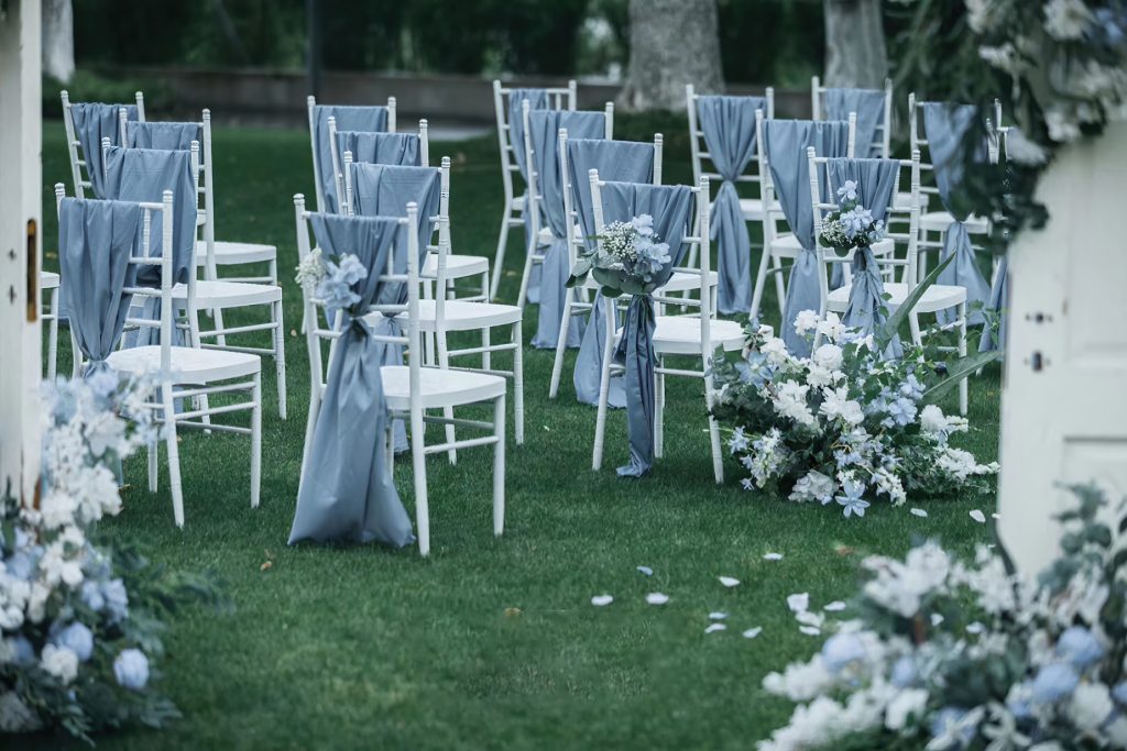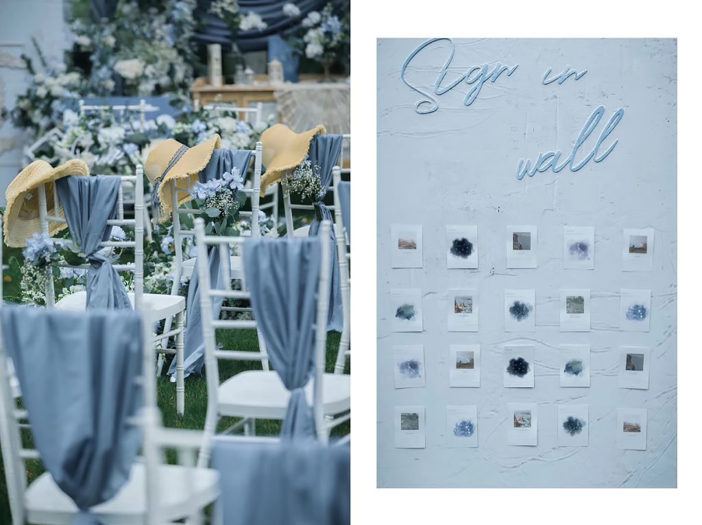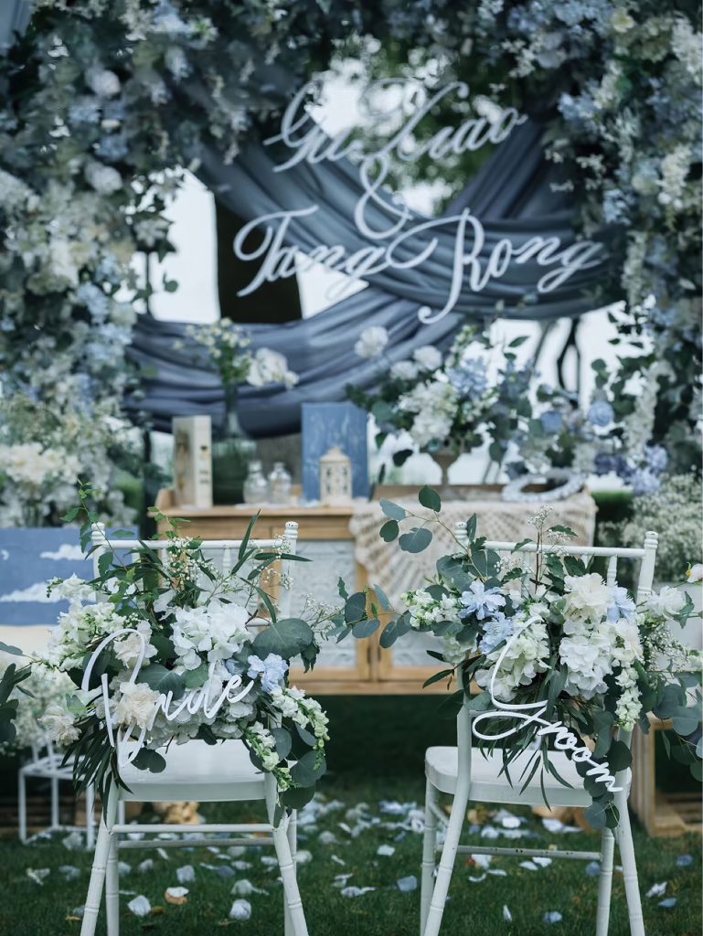 这场户外婚礼以雾霾蓝为主色调,搭配白色与绿植,营造出清新雅致的氛围。仪式区,白色的椅子系着雾霾蓝丝带,旁侧簇拥着蓝白相间的花束,一条由花瓣铺就的小径,通向被蓝白色花艺环绕的仪式中心,仿佛在邀请新人步入幸福殿堂。