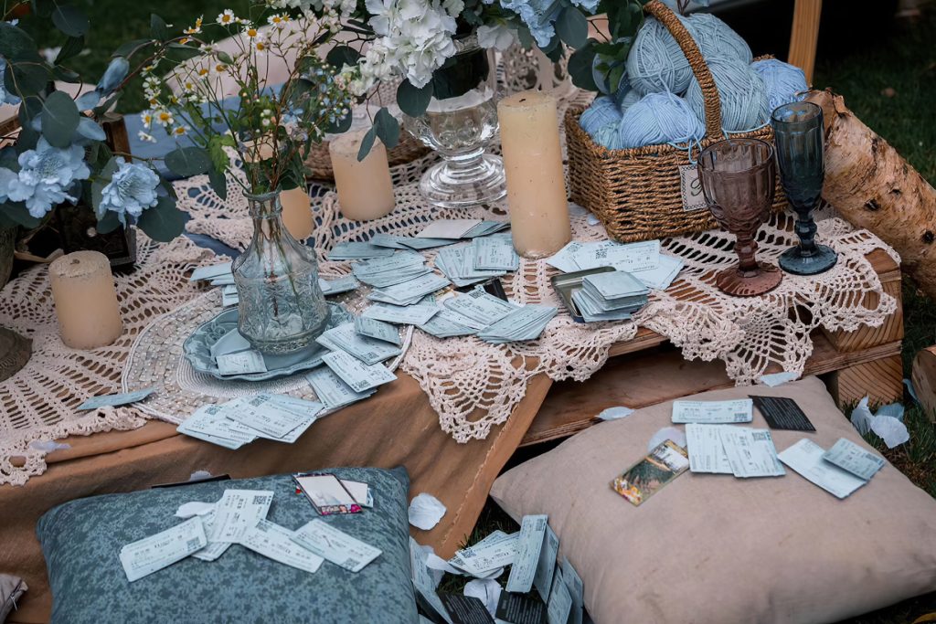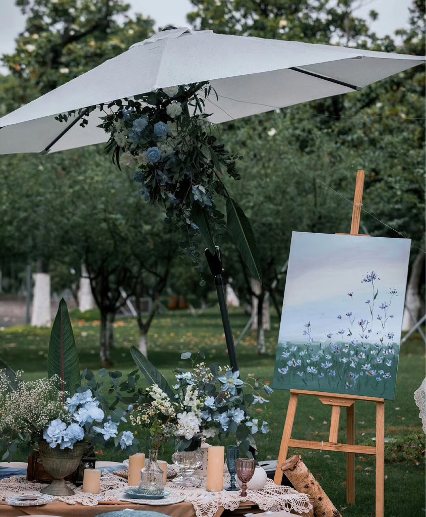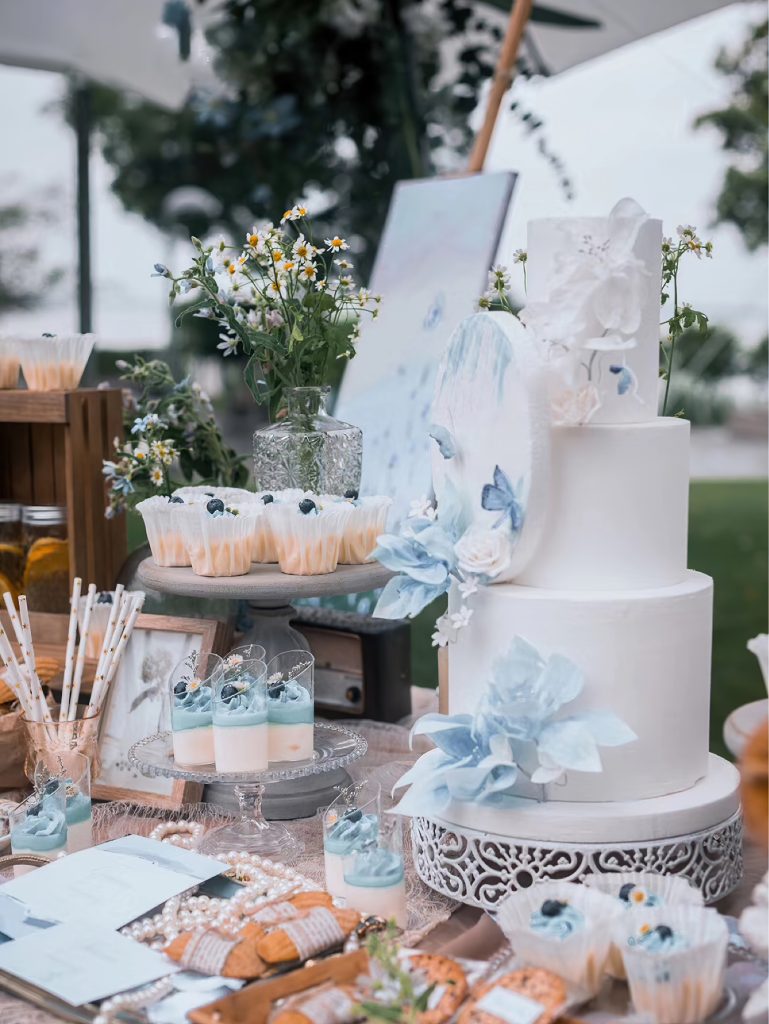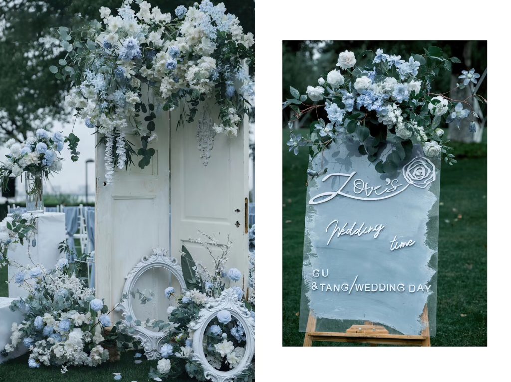 布置细节处处用心,复古的白色木门被蓝白色花朵装点,旁边的透明迎宾牌上,“Love’s Wedding time” 字样精致浪漫。野餐区域,白色蕾丝桌布上摆放着蓝白色花束、蜡烛与复古杯具,还有装满蓝色毛线的篮子,充满生活气息与巧思。整体场景清新又浪漫,给人一种置身于静谧美好世界的感觉,为新人的婚礼增添了独特的记忆点。