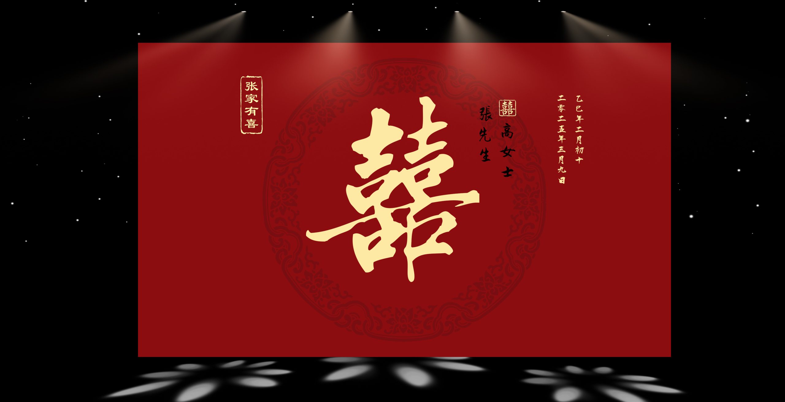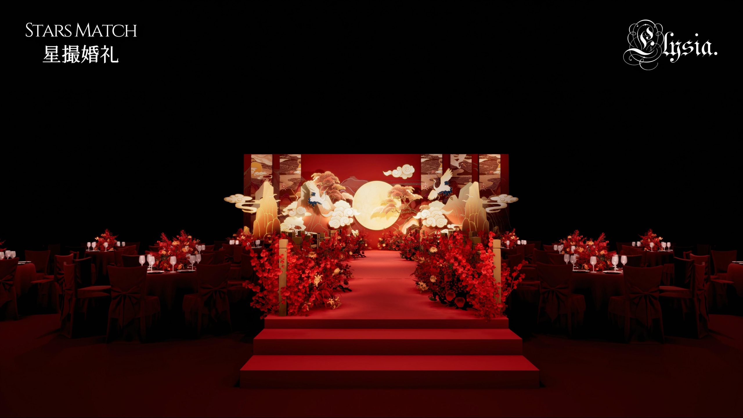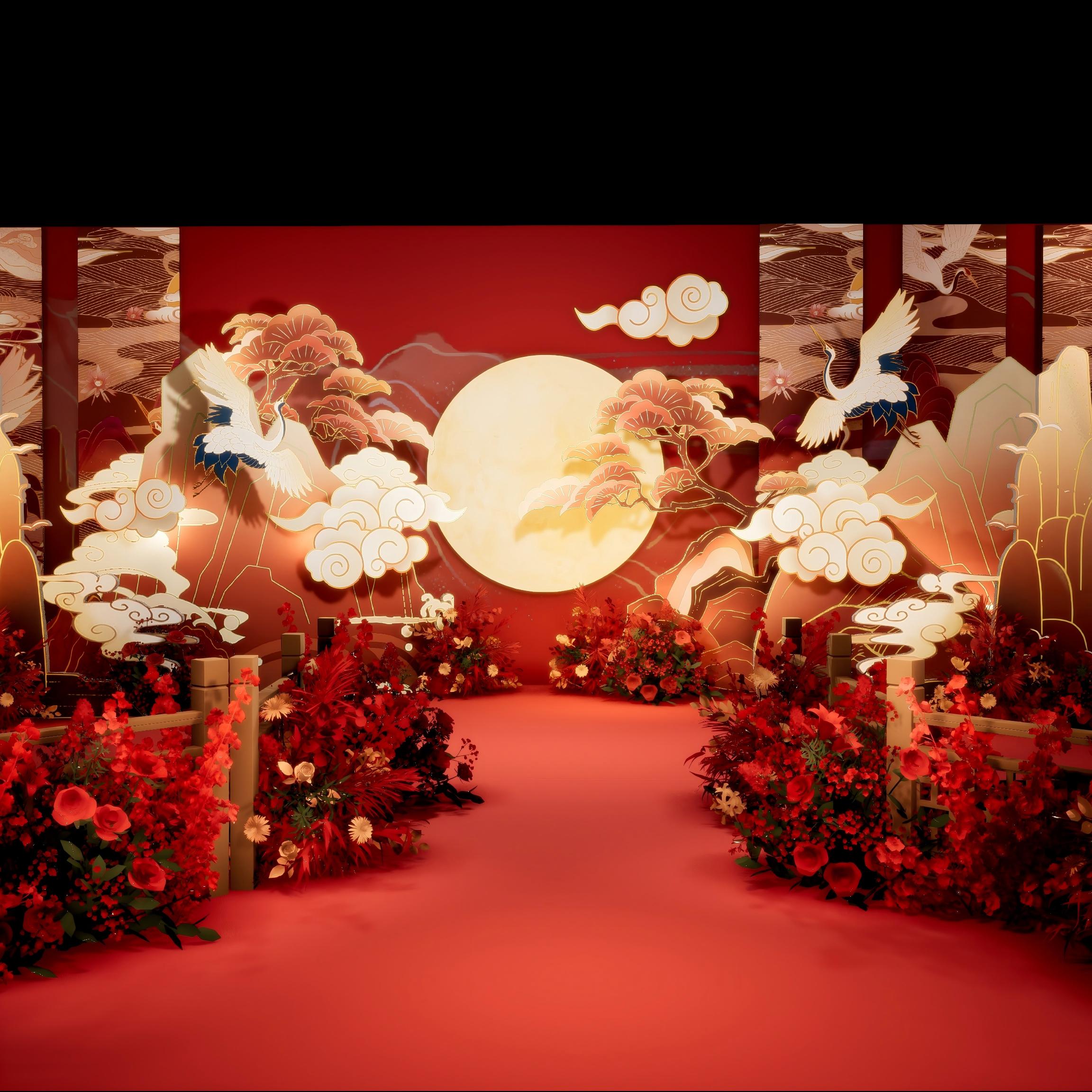 大红的主调,像把中式的喜庆与热烈都揉进了这场婚礼。背景墙上,圆月、祥云、仙鹤相映成趣,仿佛一幅灵动的古典画卷,诉说着 “松鹤延年”“花好月圆” 的美好期许。