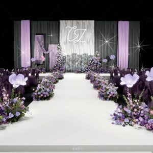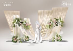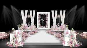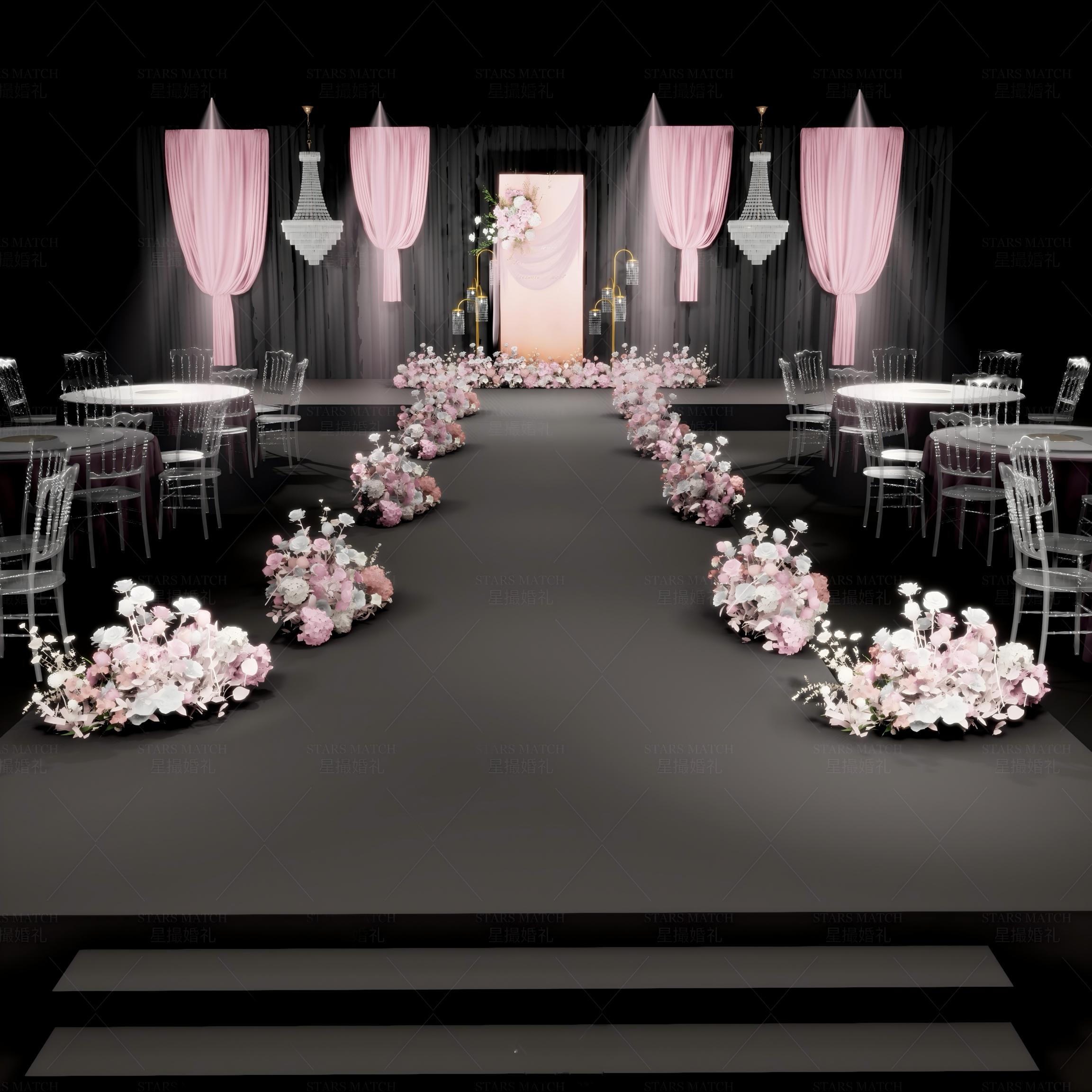当柔粉撞上深邃黑,一场优雅又浪漫的协奏就此展开。通道如墨,两侧粉白花朵似繁星洒落,一路延伸至仪式区。粉纱轻垂,水晶灯流光溢彩,与背景的暗色调形成鲜明对比,却又和谐相融,仿佛在诉说着爱情里的温柔与坚定。