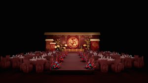 细节处更见用心,粉色系的花艺装置,搭配珍珠与大朵艺术花饰,精致又不失大气。宾客落座的区域,桌椅在灯光下泛着柔和光泽,与整体氛围呼应,让每一位到场者都能沉浸在这浪漫又高级的场域中,感受爱情最美好的模样。