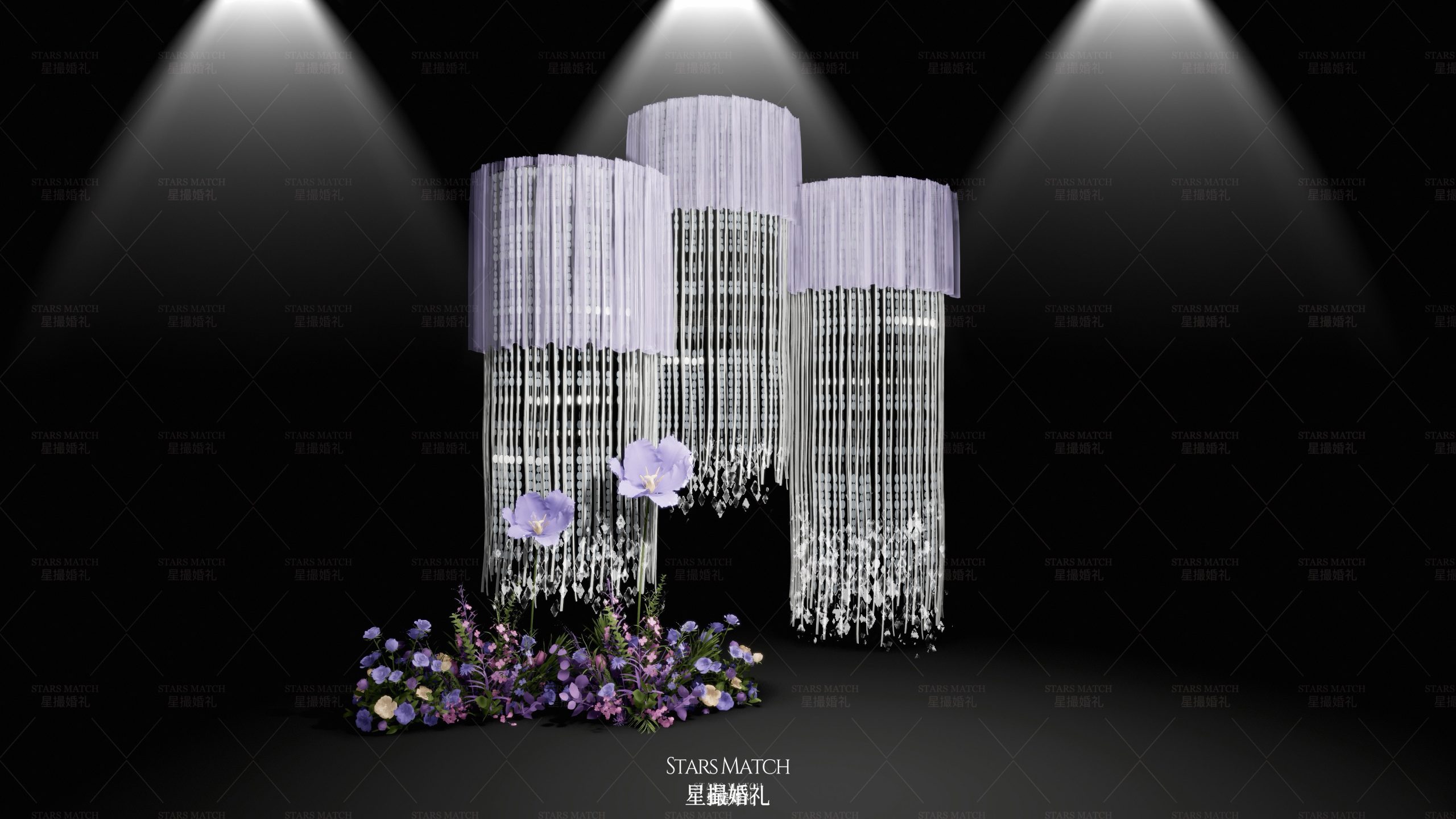 迎宾区域,独特的垂帘装置如水晶瀑布般垂下,紫色的花朵点缀其间,仿佛是为新人的爱情故事拉开了华丽的序幕,让每一位到场的宾客都能提前感受到这场婚礼的浪漫与美好。