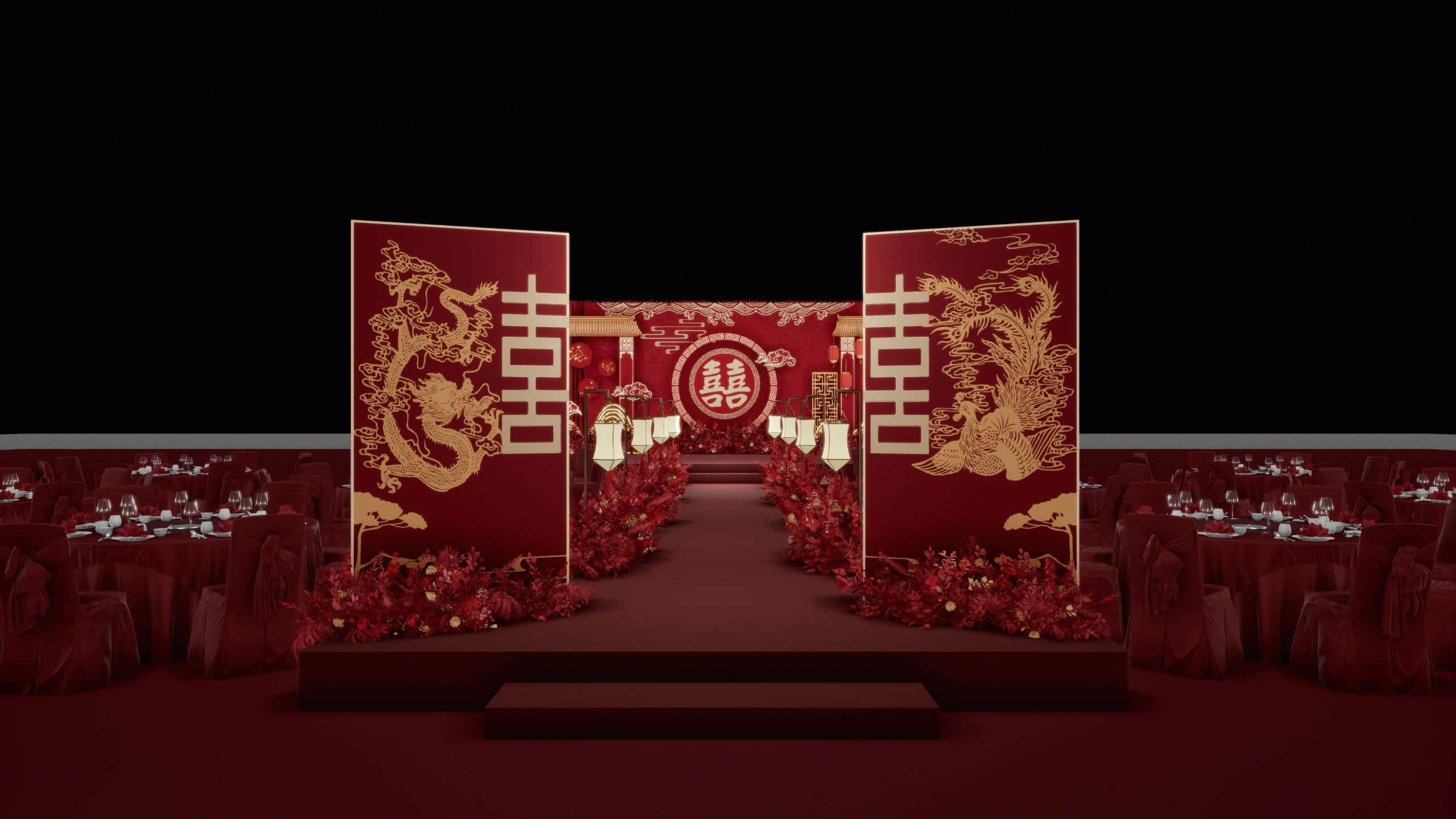 从通道到仪式区,红色的元素贯穿…