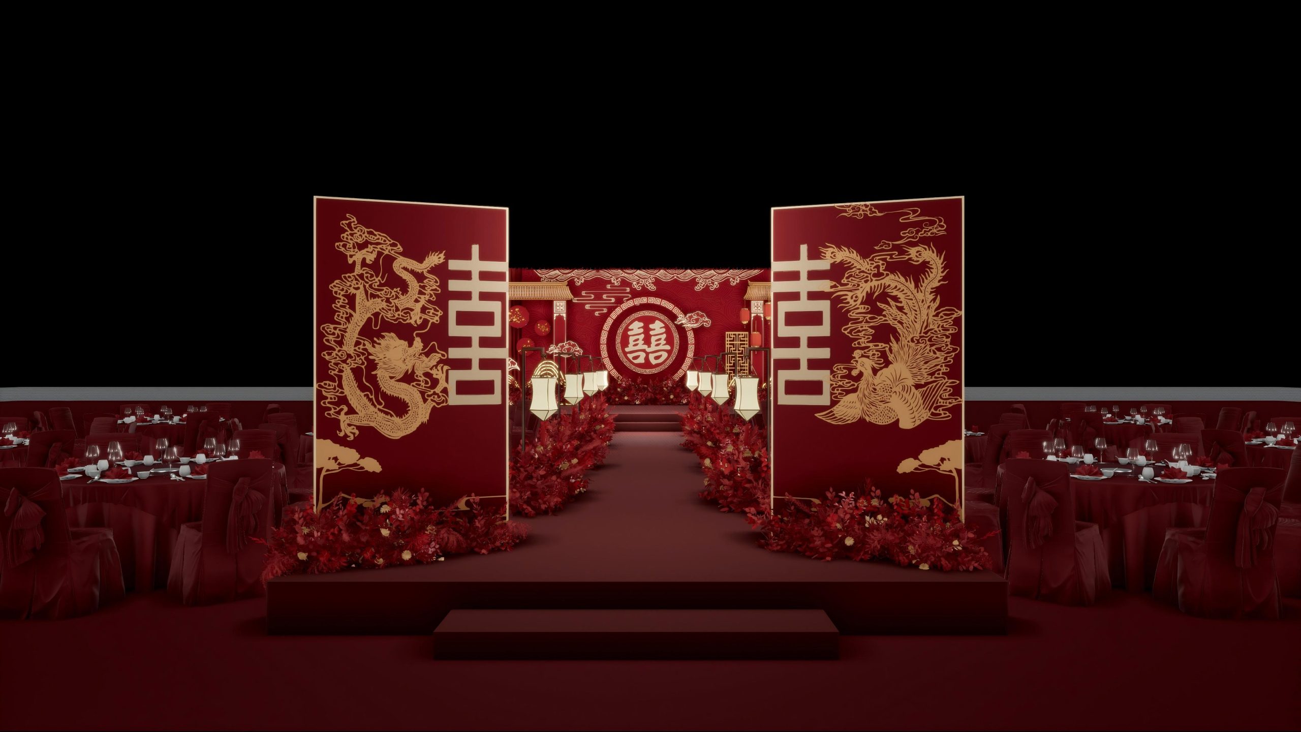 通道两侧,红色花艺热烈绽放,与整体的红金色调相融,既保留了中式婚礼的庄重,又添了几分鲜活的美感。宾客落座的区域,红色的布置与主场地呼应,让每一位到场者都能沉浸在这浓郁又高级的中式氛围中,感受传统婚礼里蕴藏的浪漫与深情。