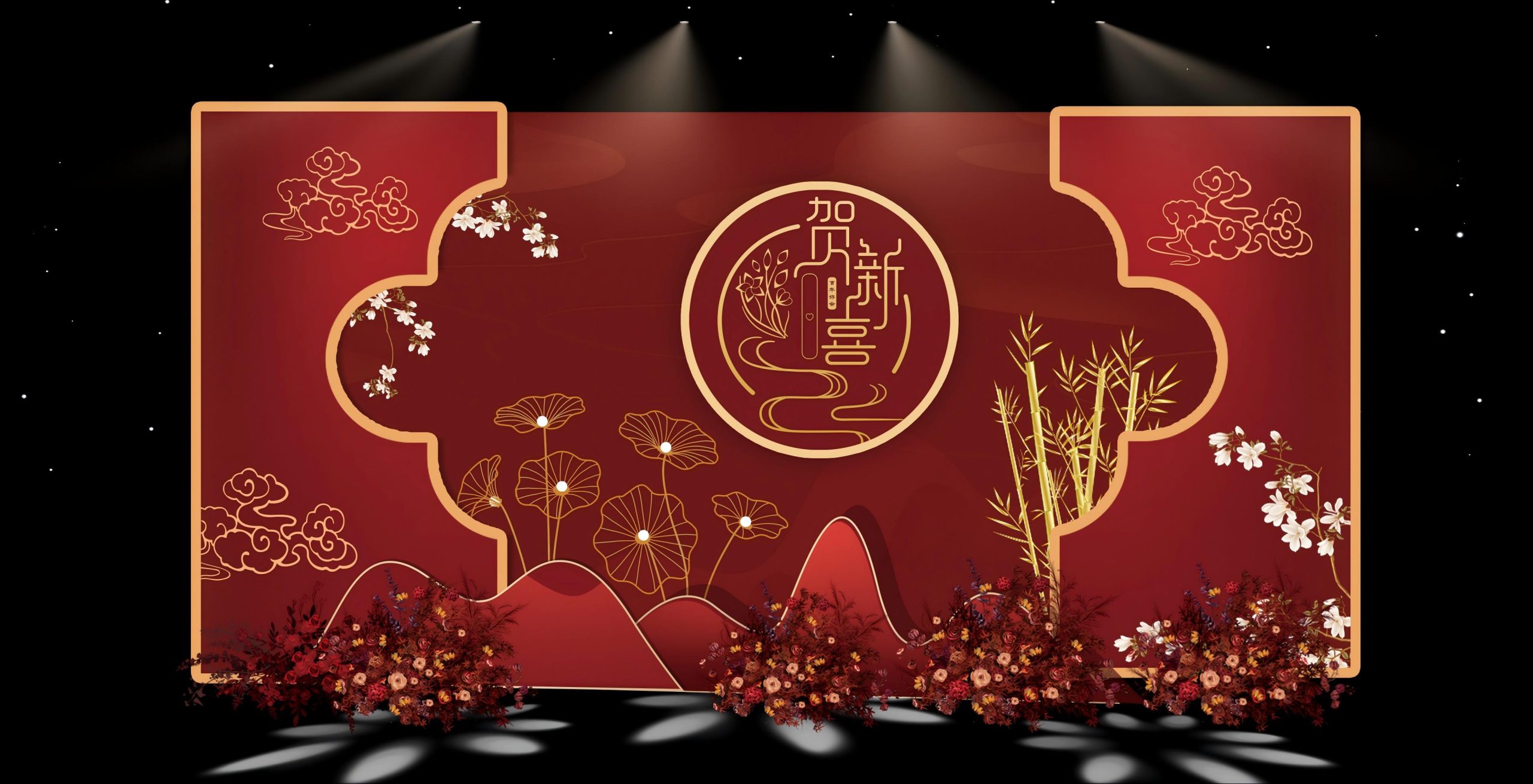 当传统红遇上奢华金,一场中式浪漫的盛宴就此展开。龙凤呈祥的金色纹样,在红底的衬托下愈发灵动,仿佛要从装饰板上腾飞而出,诉说着古老的吉祥寓意。“囍” 字醒目又喜庆,是对新人美好姻缘的最直接祝福。