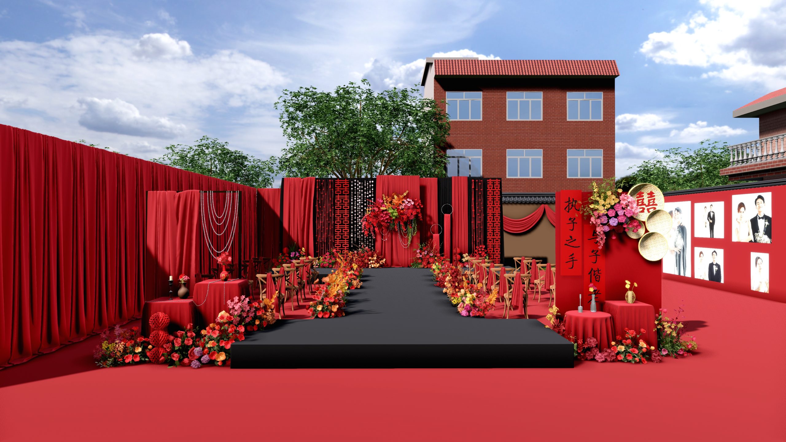当经典红撞上深邃黑,一场摩登又不失传统韵味的婚礼就此铺展。红色帷幔如烈焰般热烈,黑色背景则衬得 “囍” 字与花艺愈发夺目。那簇色彩浓烈的花束,红橙交织,像把盛夏的热情都凝在了枝头,珍珠链的点缀又添了丝精致感。