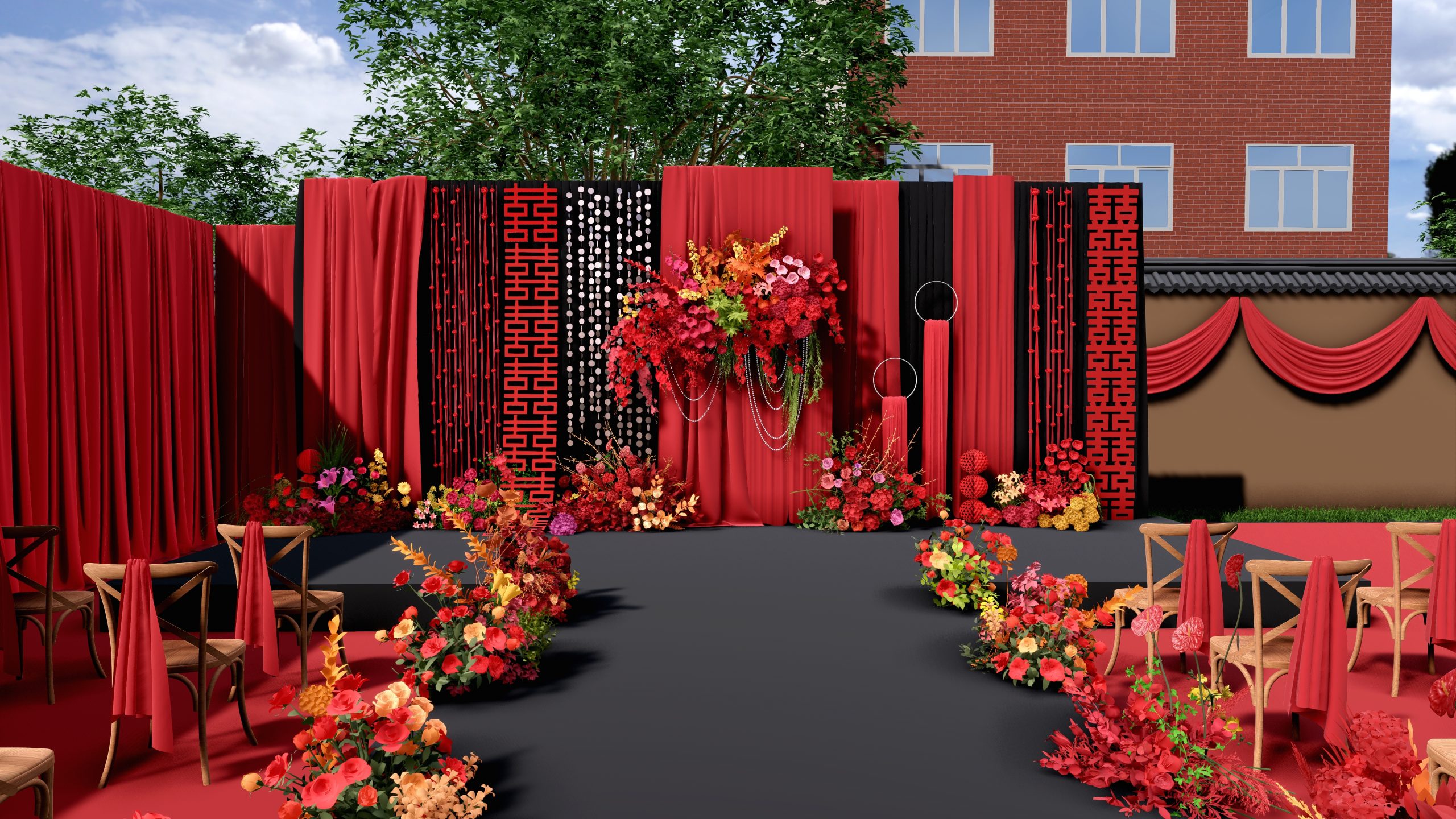 周围的花簇错落分布,红的热烈、粉的温柔、橙的明媚,与红黑主调相融,既保留了中式婚礼的喜庆,又多了份现代的鲜活。置身其中,能感受到传统与摩登的巧妙碰撞,仿佛在诉说着新人既爱传统底蕴,又追时尚鲜活的爱情故事。