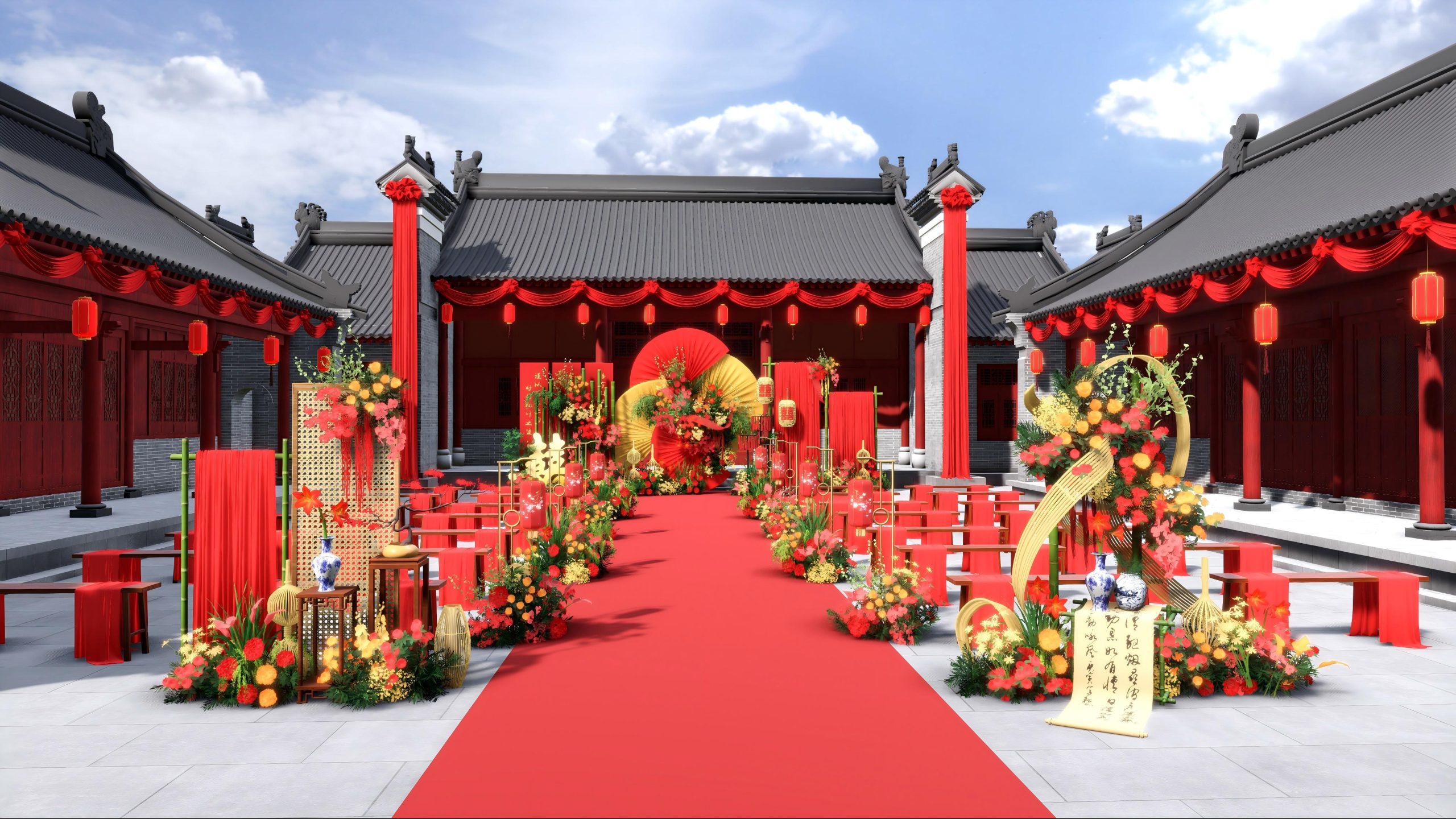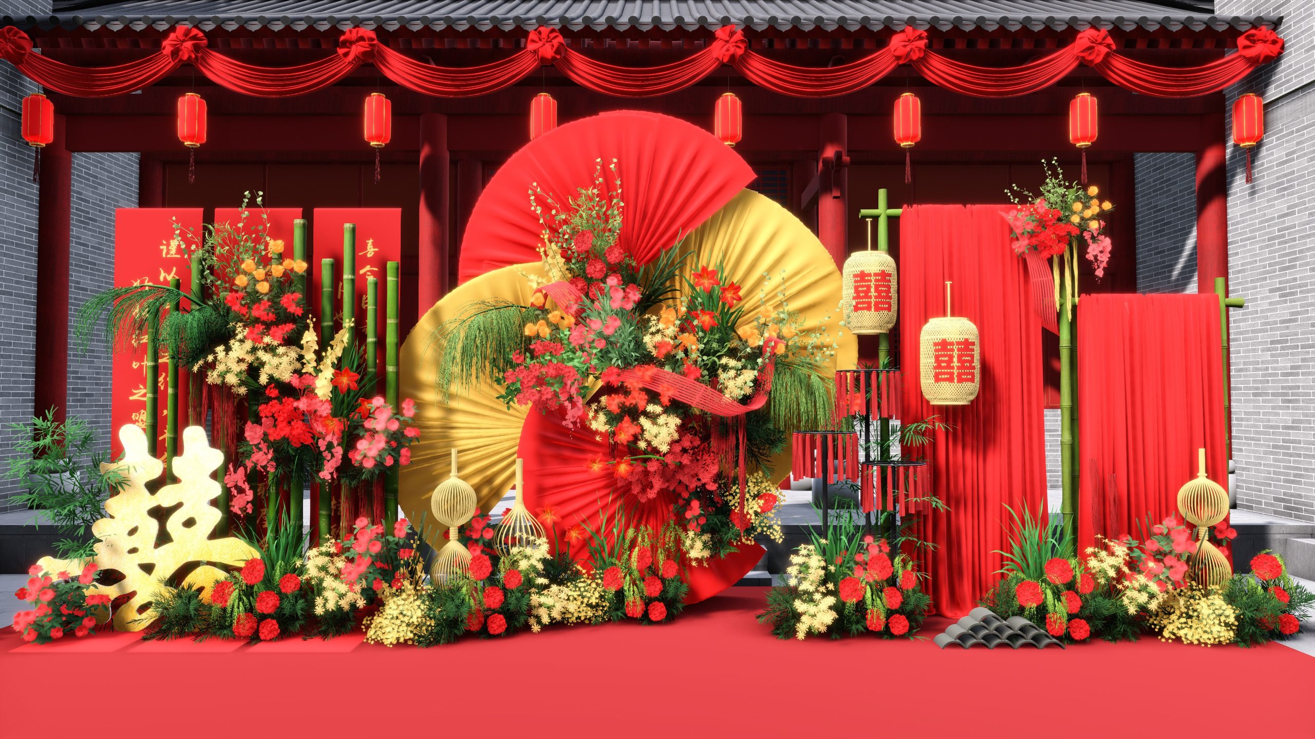 红与金的碰撞,在这场婚礼里有了鲜活的表达。大红的绸带如瀑布般垂落,红灯笼摇曳生姿,透着浓浓的中式喜庆。巨型的红金折扇造型别致,簇拥着色彩绚烂的花束,像是把春日花园的热闹,都收进了这一方天地。
