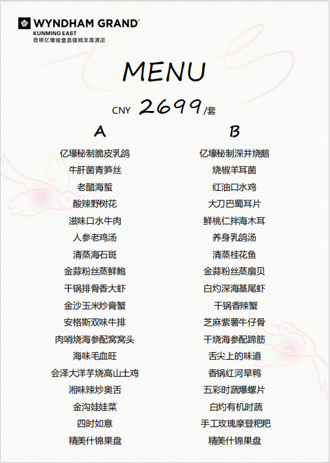 昆明亿壕城堡温德姆至尊酒店—-2699元AB套菜单