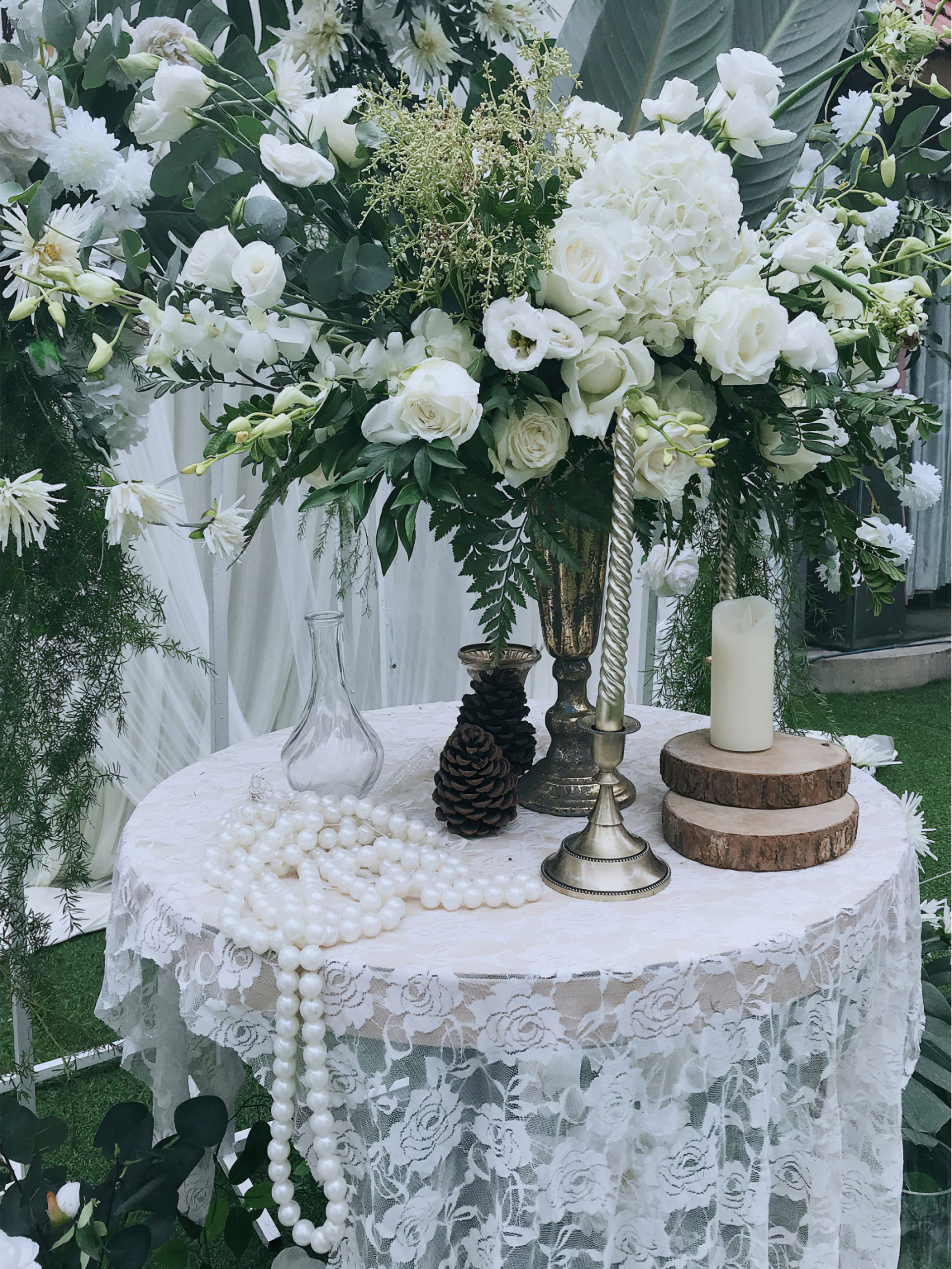 这套布置套装融合白绿花艺、藤编装饰、蕾丝元素等多重森系元素。白色花卉与绿色枝叶的搭配清新自然,藤编灯饰与蕾丝桌布的点缀更添复古质感,从仪式区到迎宾区,整体风格统一且充满自然层次感,让你的婚礼现场每一处都散发着森系的清新魅力。