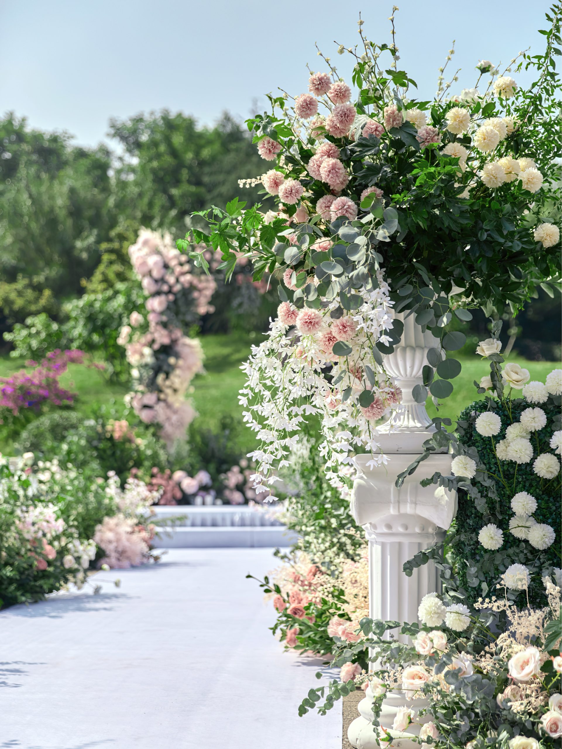 以柔粉与清新绿为主色调,套装包含仪式区拱门花艺、通道花簇、迎宾装饰等全场景布置。精选高仿真花材,还原鲜花的柔美形态与自然色泽,粉白花朵与翠绿枝叶交织,营造出如秘境般的森系花境。无论是拱门上方层层叠叠的花簇,还是通道两侧错落有致的花艺,都经过专业设计,让你的婚礼现场从任何角度看都充满层次感与艺术感。