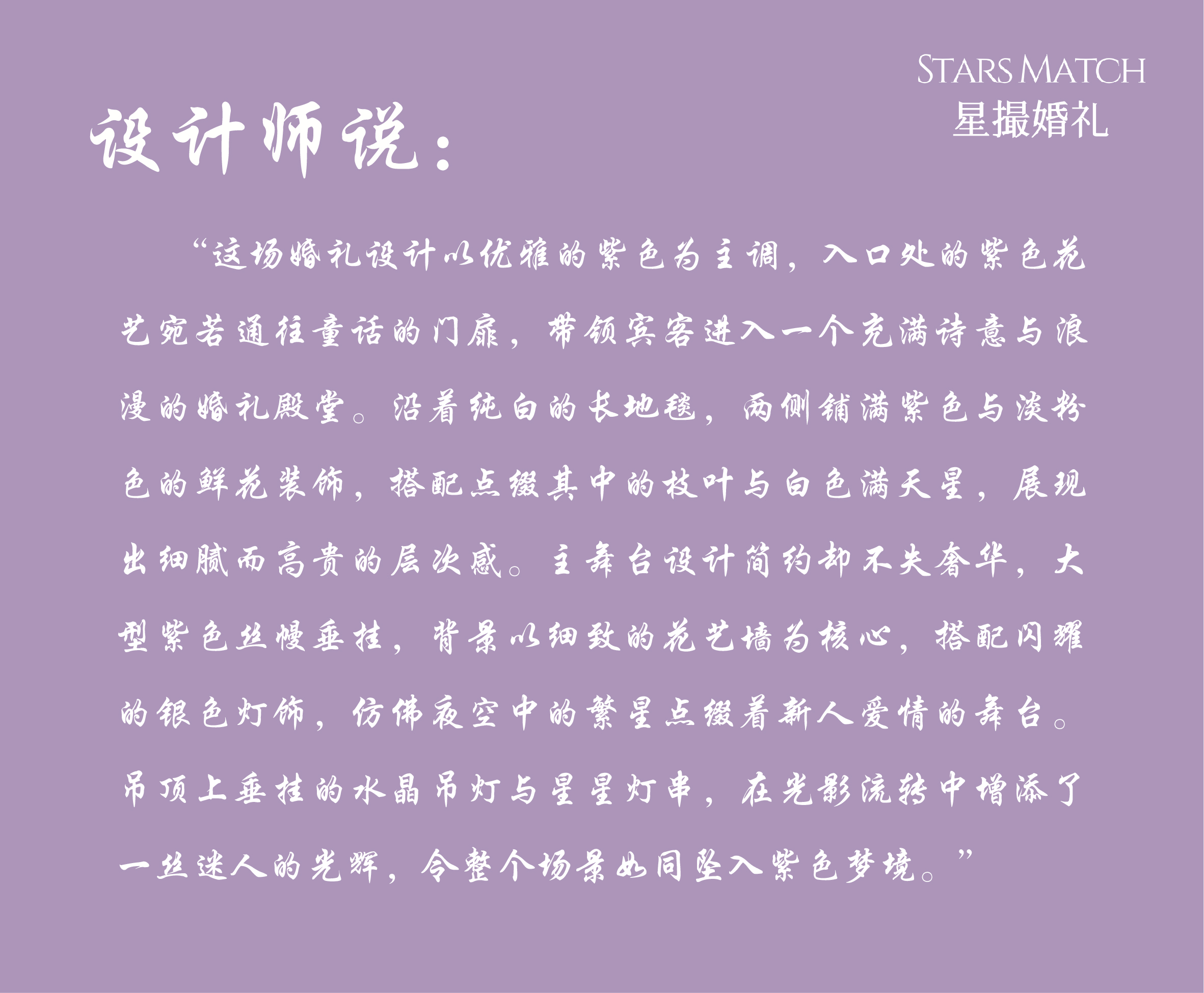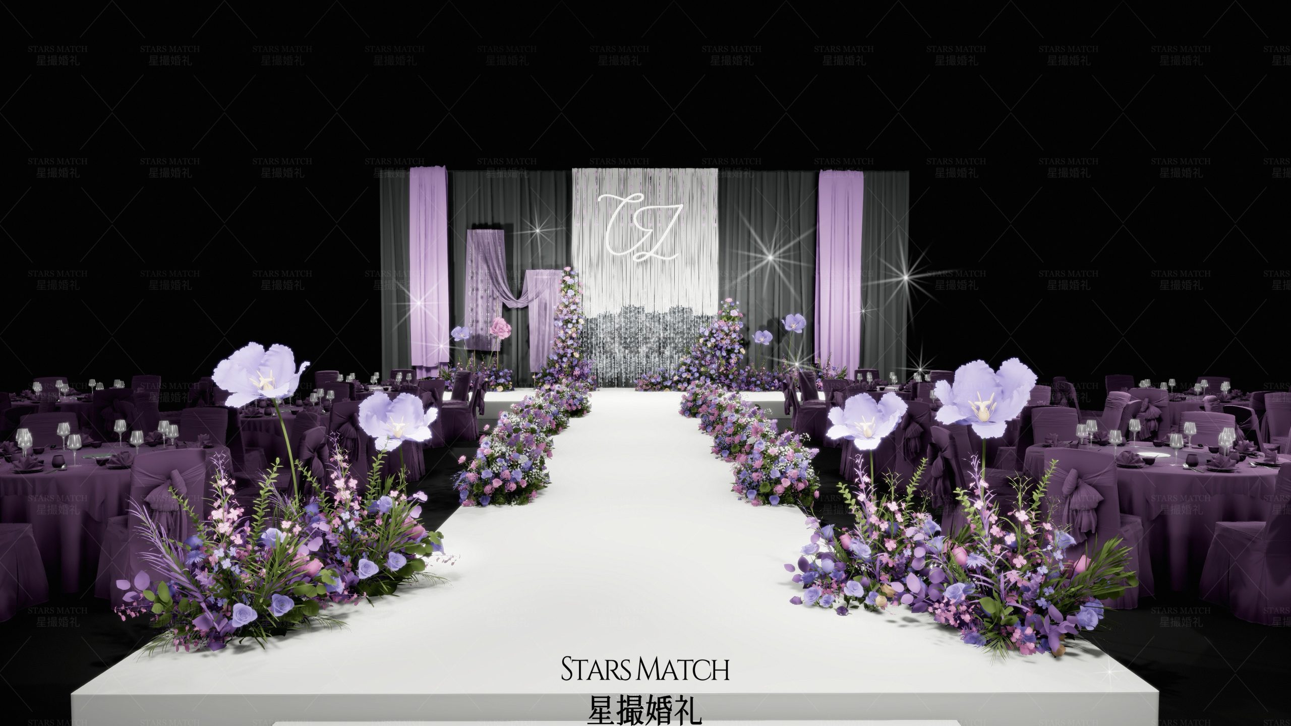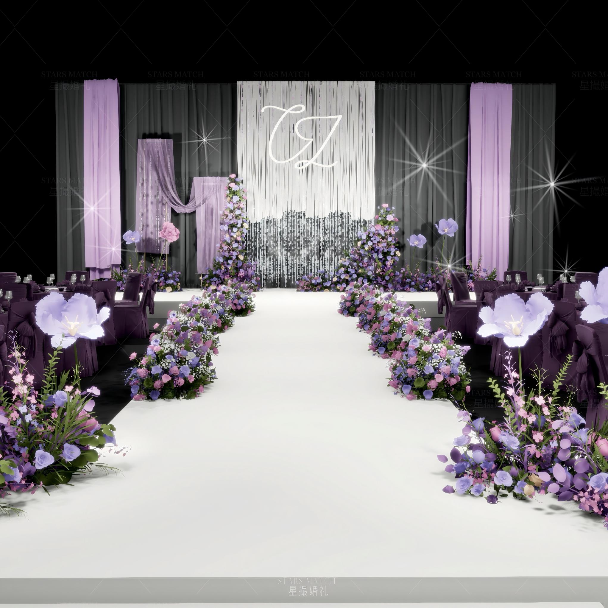 浅紫与深紫交织,如梦幻的绸缎,在婚礼现场铺展开优雅的底色。鲜花沿着洁白的通道肆意绽放,似紫色的云霞洒落人间,背景上的字母标识,为这场浪漫增添了专属的仪式感。灯光穿梭其间,漾起细碎的流光,每一处都透着高级又自然的美感,仿佛爱也在这紫韵流光中,酿成了最浪漫的誓约。