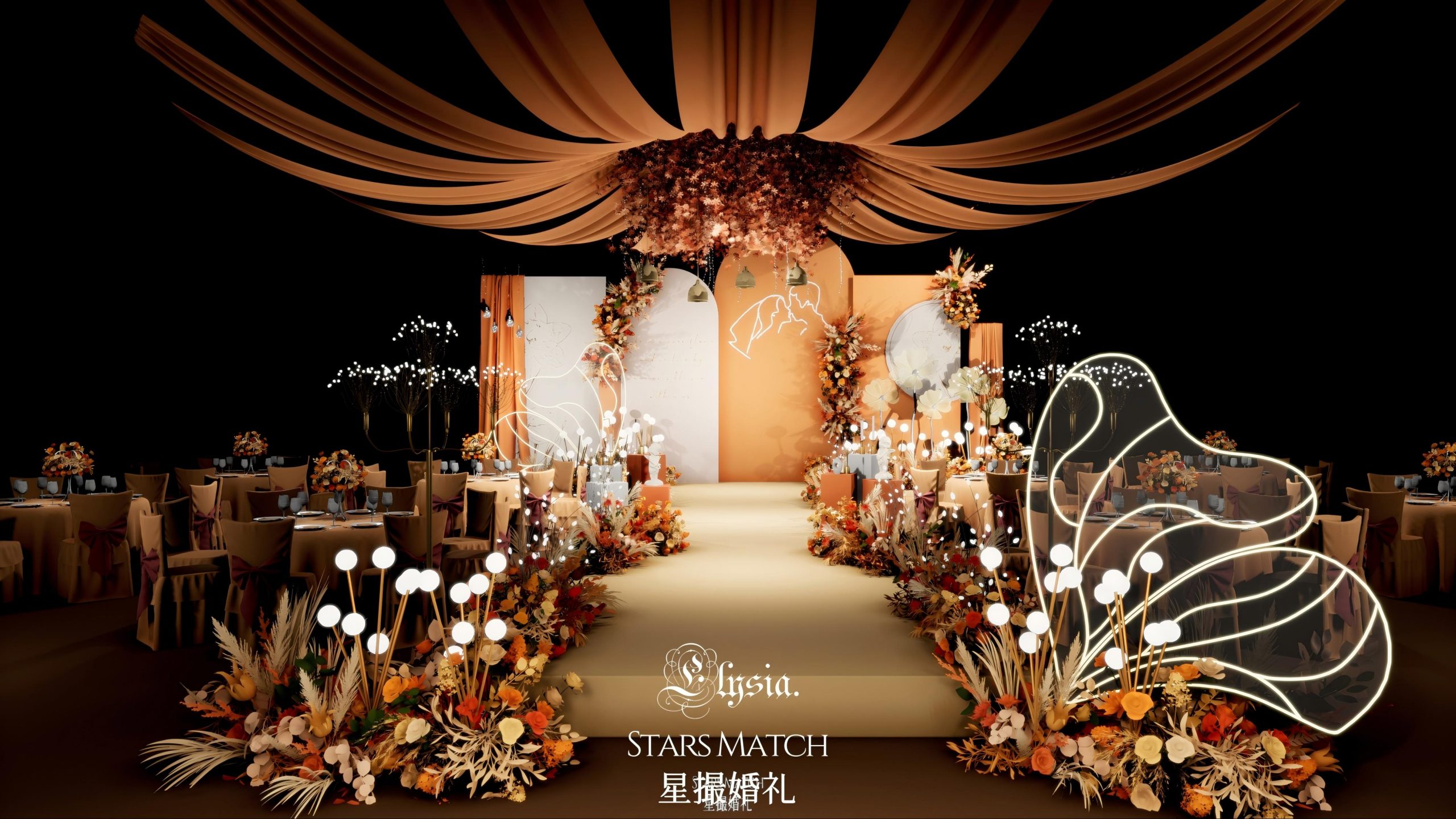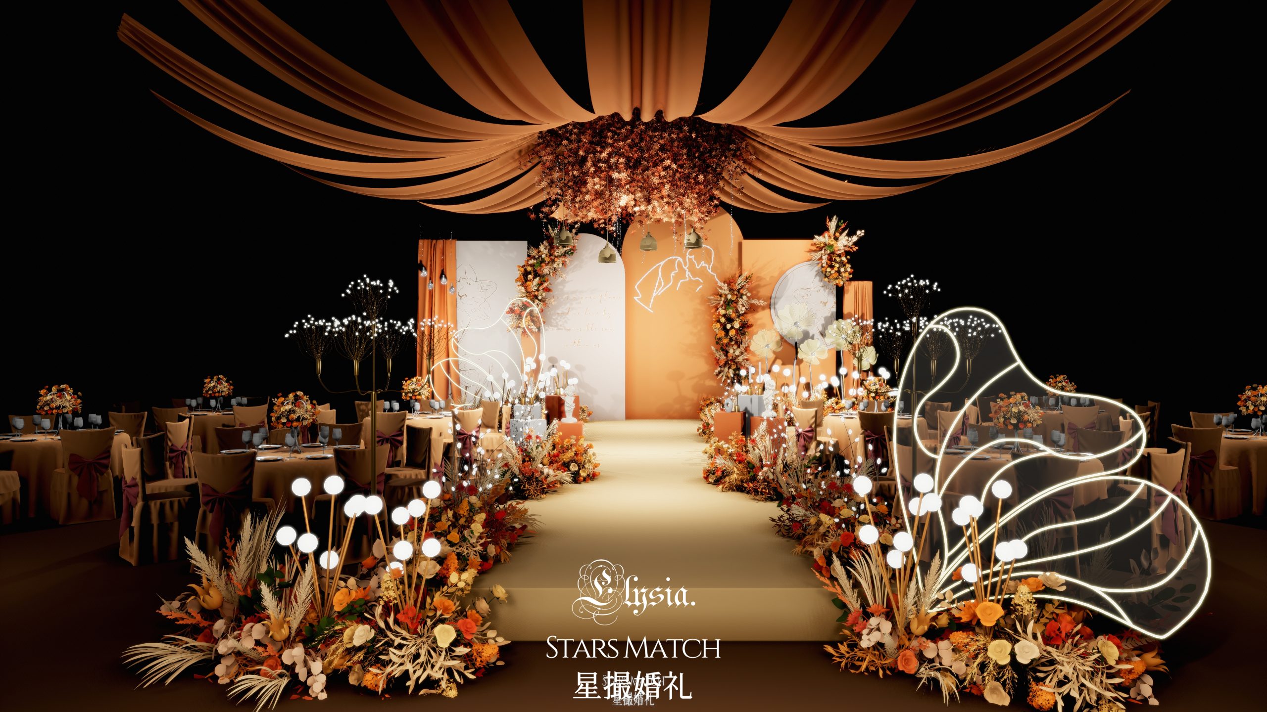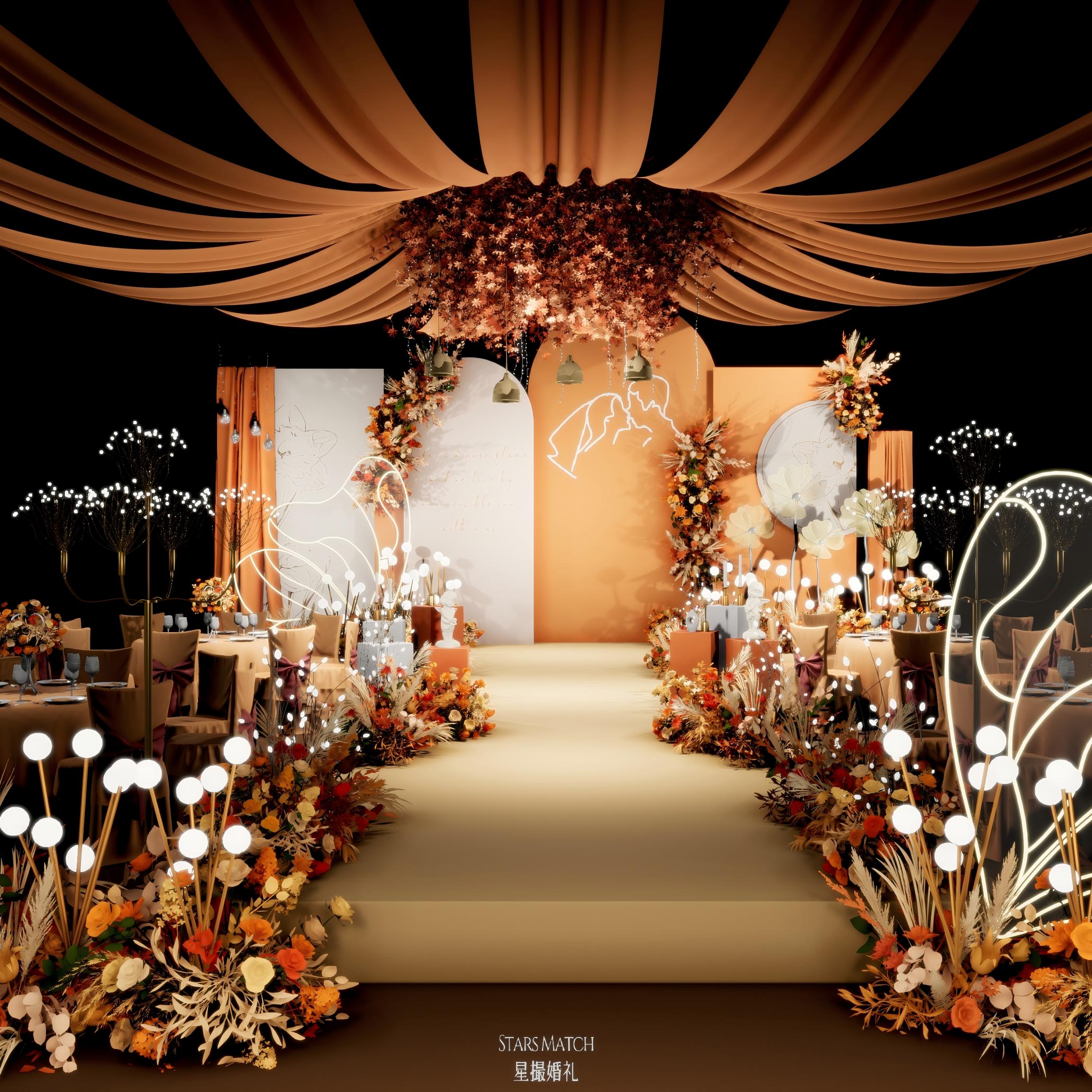当暖橘与自然花艺相遇,一场充满高级感的婚礼便悄然诞生。纱幔的褶皱里藏着温柔,花束的姿态中透着肆意,灯光在其间穿梭,营造出静谧又浪漫的氛围。无需过多繁复装饰,这份取自自然与暖调的美好,就已足够让这场婚礼,成为记忆里一抹温暖且高级的存在。