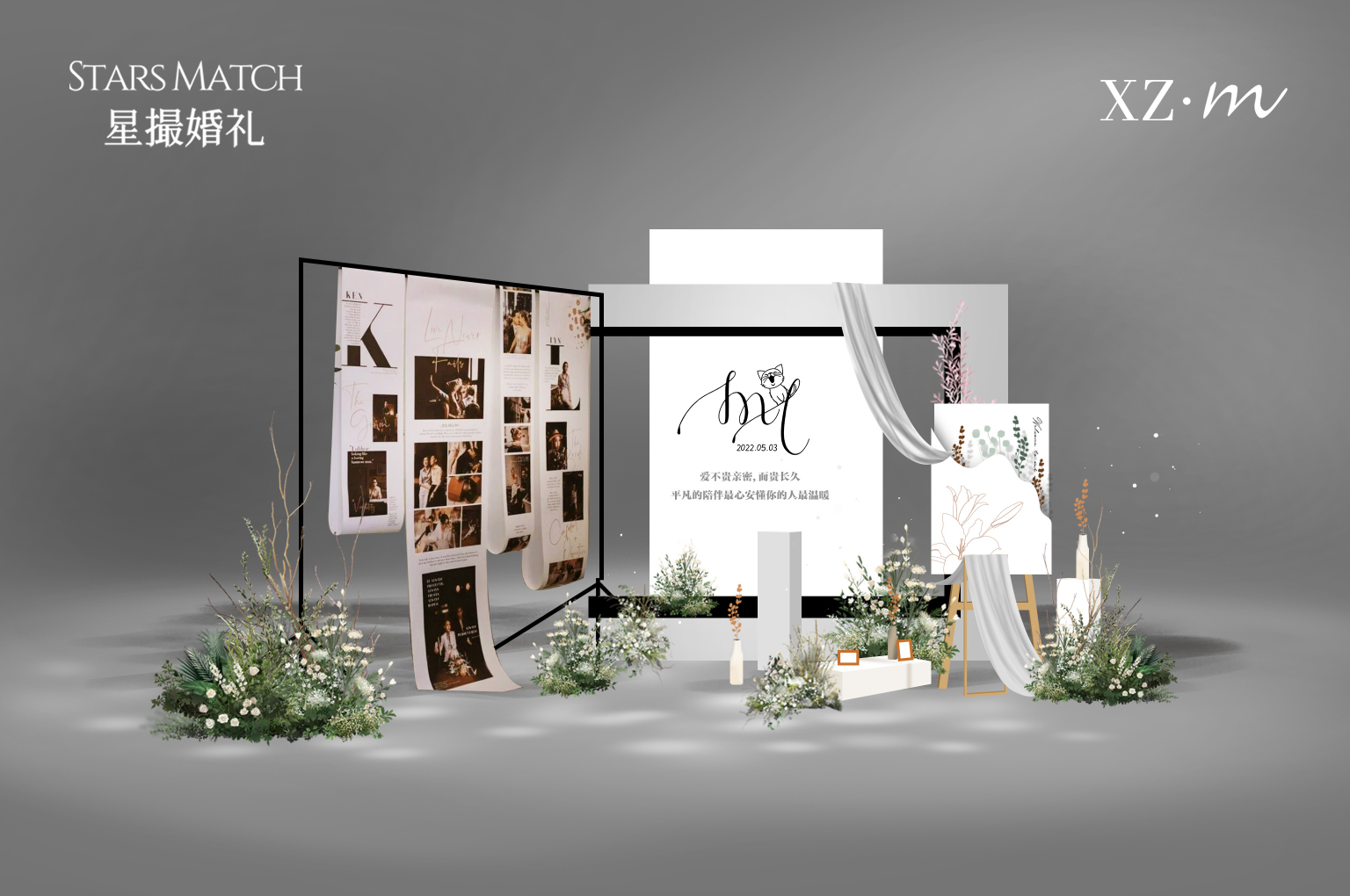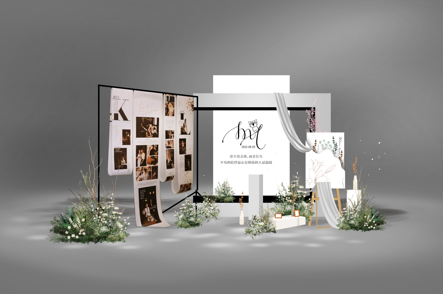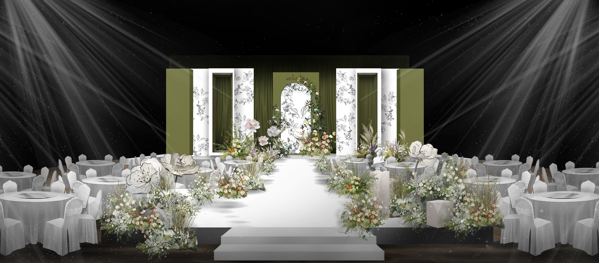想要一场沉浸式自然浪漫婚礼?选这款布置套餐就对啦!主背景以深绿为底,象征生命与希望,搭配白色系淡雅花纹,瞬间拉满典雅宁静氛围。