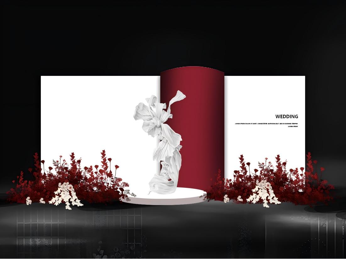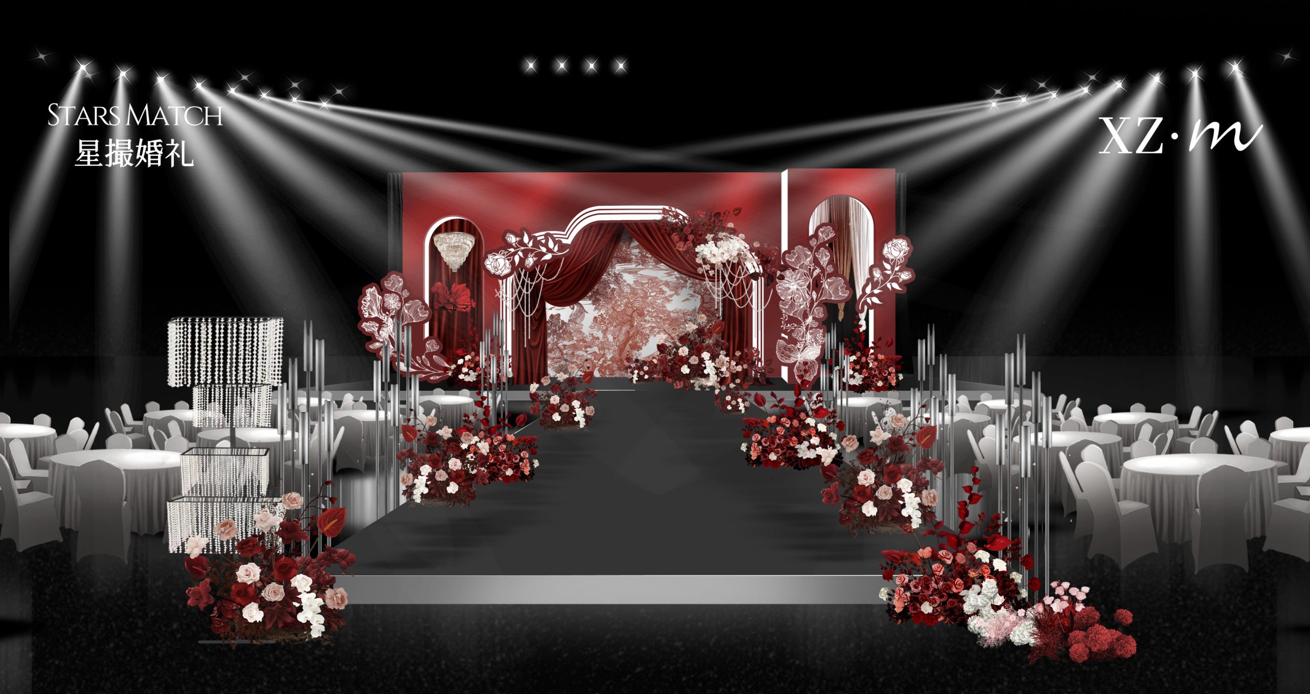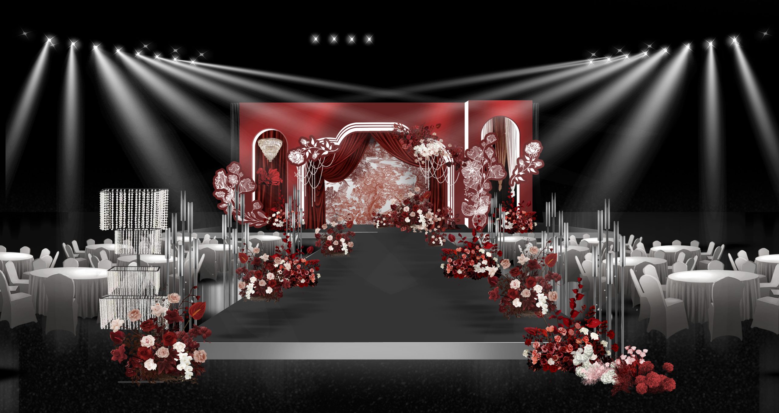 这场婚礼布置以红白色为主,尽显典雅与浪漫。主舞台红色背景搭配白色装饰线条,拱形设计与红色幕布营造出仪式感,花卉装饰丰富了视觉层次。通道两侧红白色花艺错落有致,延伸出浪漫氛围。迎宾区红白配色的装置,搭配精致花艺,简约又不失格调,整体布置为婚礼增添了浓郁的幸福气息,打造出一场经典又难忘的婚礼。