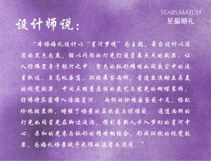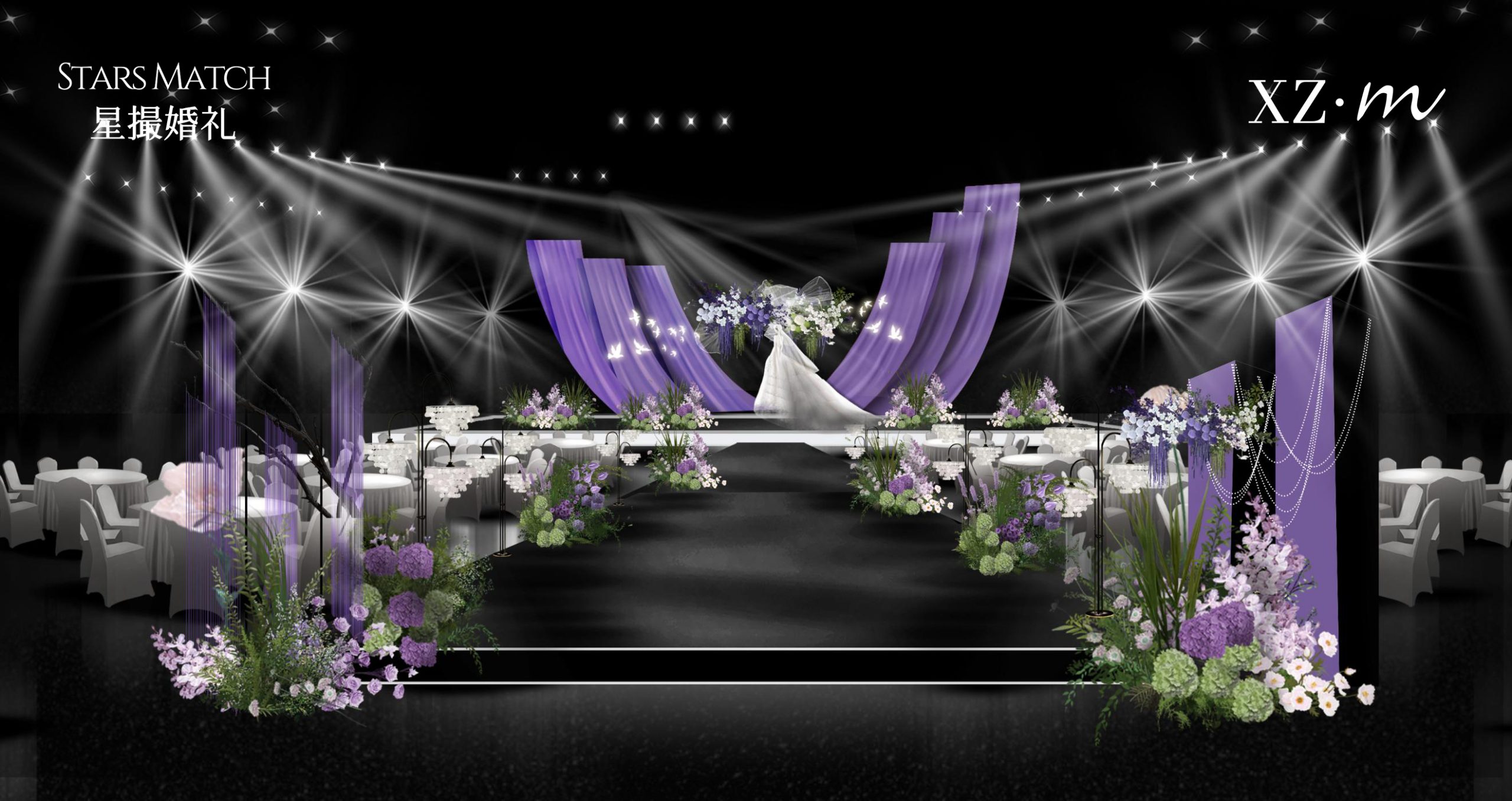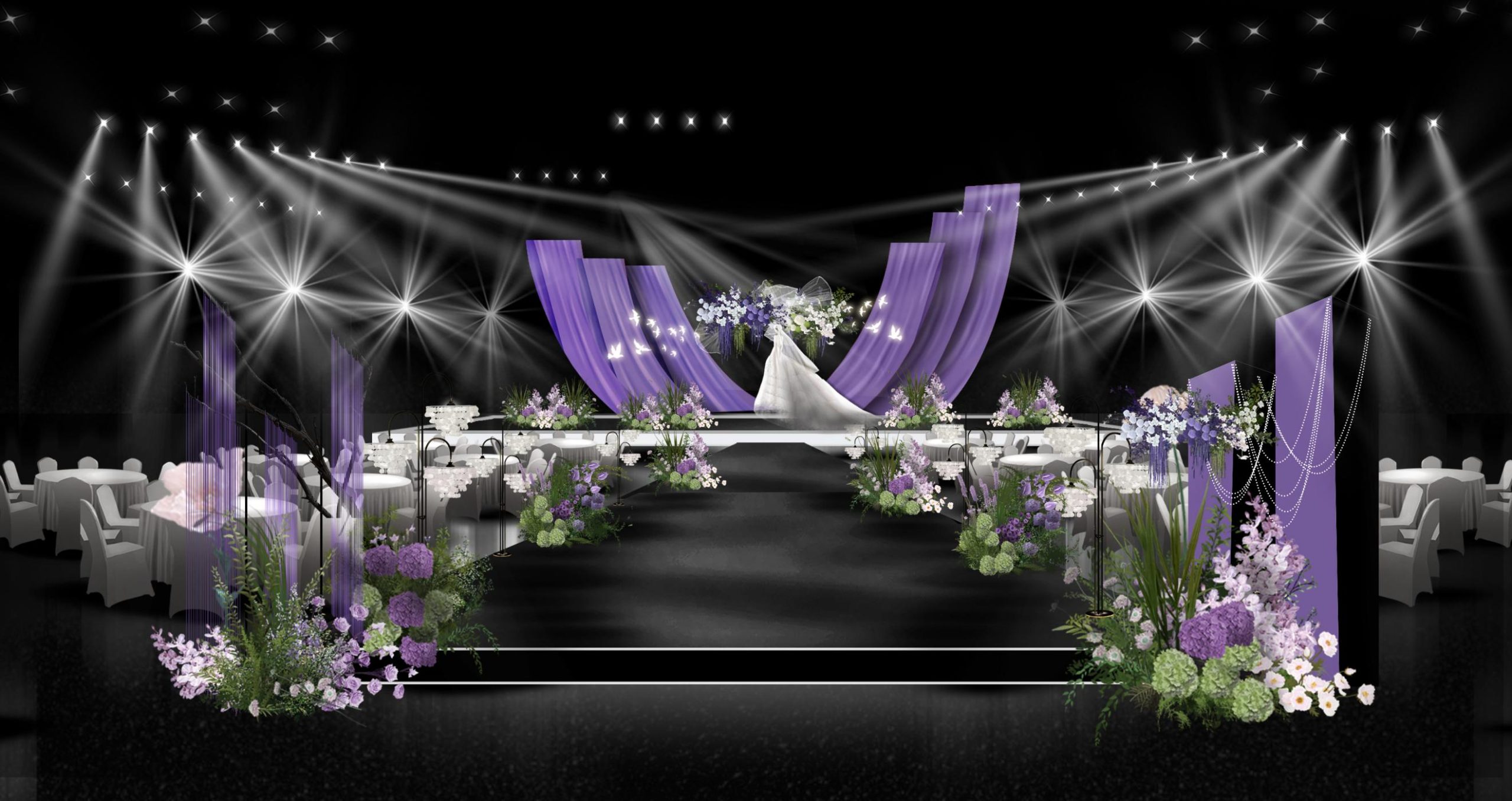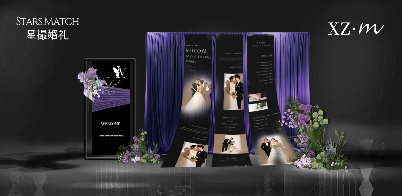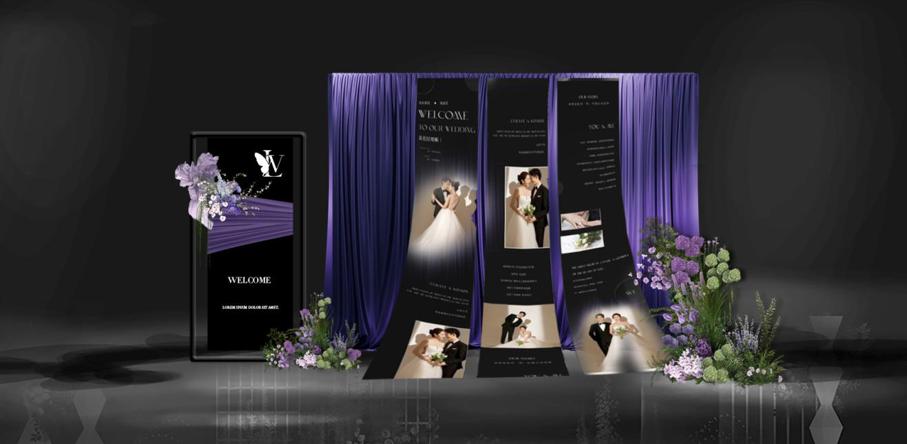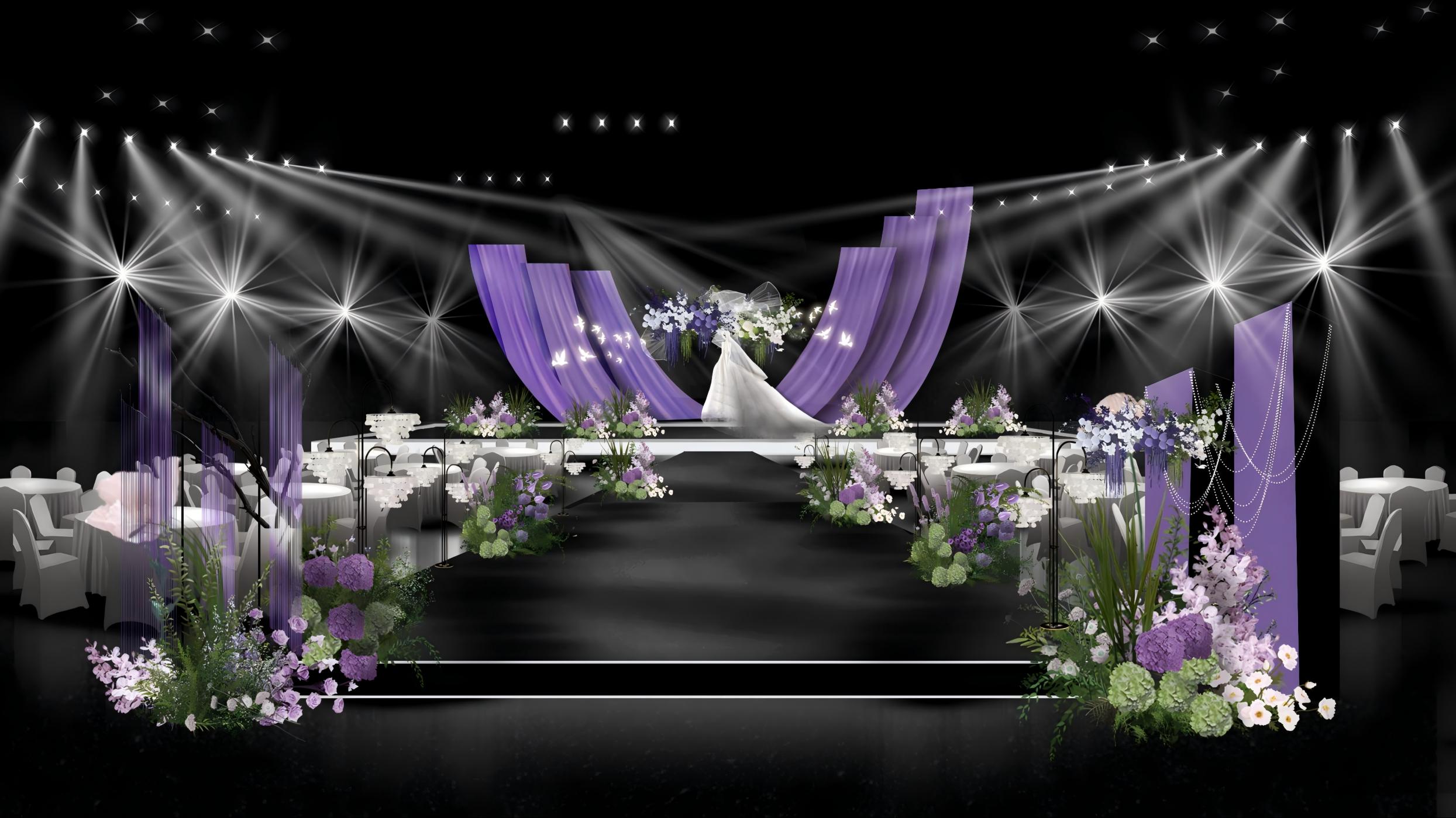 这款婚礼布置以紫色为主色调,搭配白色与淡紫花卉,打造出梦幻浪漫的童话氛围。主舞台紫色弧形帷幔如梦幻羽翼,中间的花艺装饰精致,与帷幔相得益彰,仿佛将新人包裹在浪漫之中。通道两侧紫色与白色花卉错落分布,延伸出优雅的仪式感。迎宾区紫色帷幔搭配新人照片展示,加上紫色花艺点缀,让宾客一到场就感受到婚礼的甜蜜与梦幻,整体布置为新人打造出一场如童话般美好的婚礼。